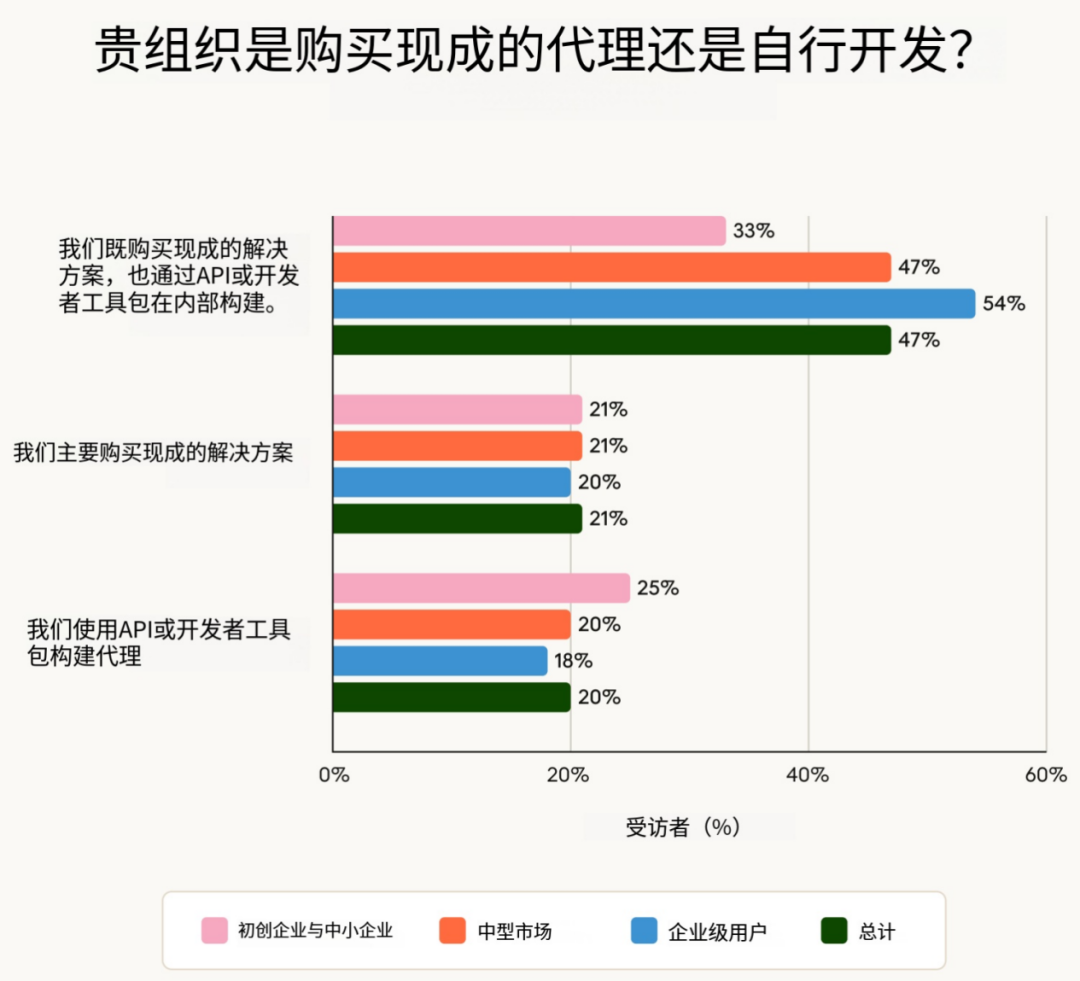 大多数组织(47%)采用混合方式来处理人工智能智能体,将现成解决方案与定制组件相结合。约五分之一(21%)的组织完全依赖预制智能体,而相近比例(20%)的组织则利用应用程序接口、开源模型或需要编码专业知识的开发工具包自行构建。