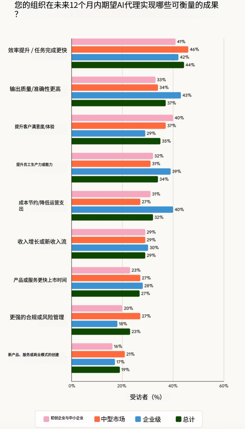 各组织期望人工智能智能体在未来 12 个月内带来效率提升,44% 的组织预计任务完成速度会更快。企业还期望除了速度之外的另一项好处:通过部署智能体实现可衡量的成本节约。