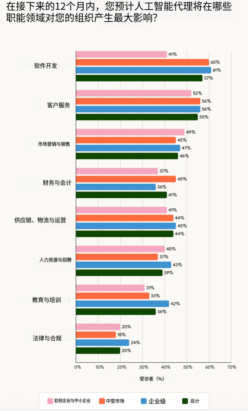 2026 年,软件开发(57%)和客户服务(55%)预计将在短期内受到 AI 智能体的最大影响,紧随其后的是市场营销与销售(46%)以及供应链、物流和运营(44%)。