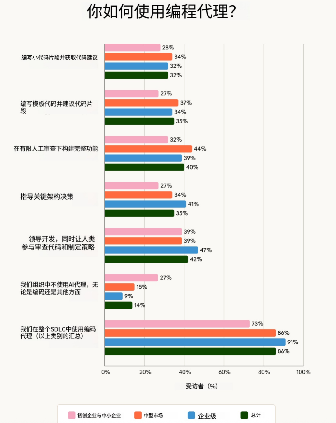 如今,超过九成的组织都在使用人工智能辅助编程。绝大多数(86%)的组织已经不再局限于试验阶段,而是将人工智能编程智能体用于生产代码的开发,其中企业的采用率领先,达到 91%,而中小型企业的这一比例为 83%。42% 的组织信任这些智能体在人类的监督下主导开发工作,这标志着工程团队的结构以及代码的编写方式正在发生重大转变。