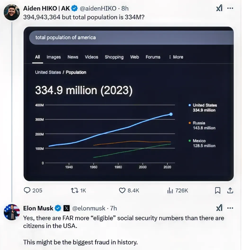 近日,特斯拉CEO马斯克通过个人网站公布了一系列令人瞠目结舌的数据,这些数据来自“效率部”的调查结果,内容涉及美国人口、社保、寿命甚至国库黄金储备,堪称“惊天动地”。首先,马斯克指出,美国总人口为3.34亿,但领取社保的人数却高达3.94亿。这一数据直接表明,美国的非法公民数量可能不少于6000万。这一发现不仅让人质疑美国人口统计的准确性,也引发了关于移民政策和社保体系的广泛讨论。