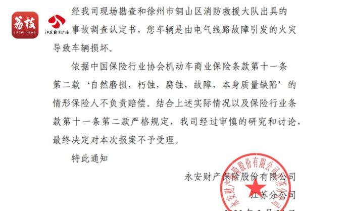 通知书声称,故障是由电气线路问题引发,因此依据相关保险条款,保险公司不承担赔偿责任。