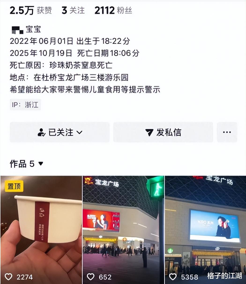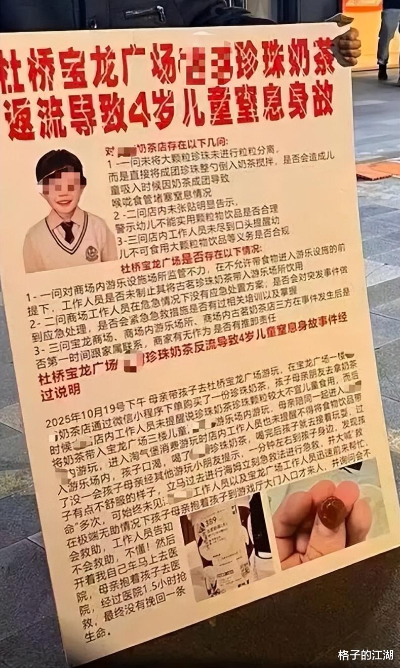 家长在社交媒体上开了账号发视频维权,因为孩子是珍珠奶茶导致的窒息,所以要追究奶茶店的责任,因为孩子是在商场的游乐区域出的事,所以要追究商场和游乐场商家的责任。