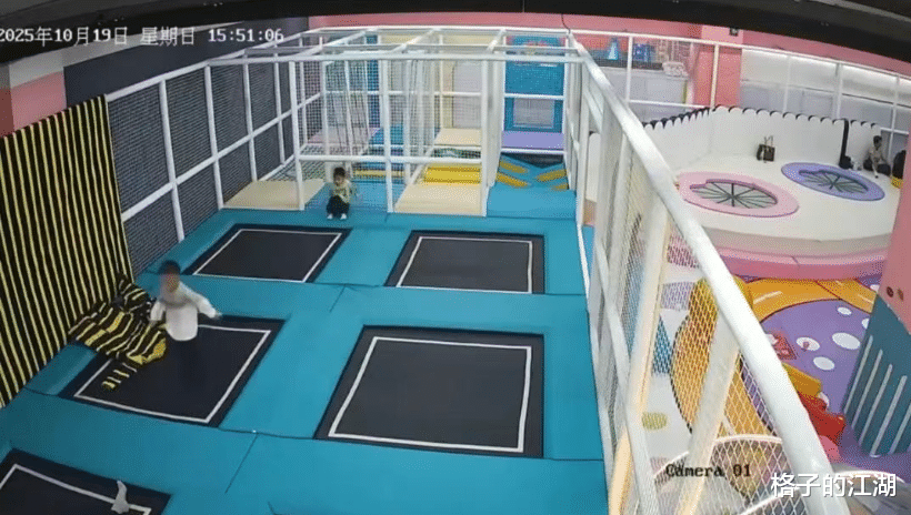 绿衣儿童喝完后继续回去玩耍,在蹦床上蹦蹦跳跳,意外也在这时发生。