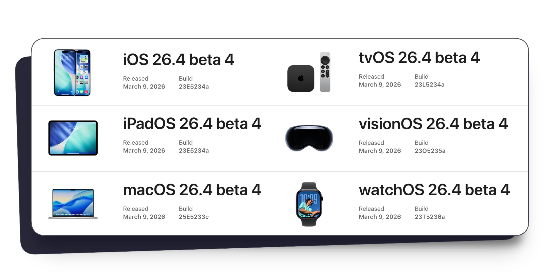 苹果在今天(3 月 10 日)凌晨向参与测试的设备推送了最新一轮开发者测试版更新,其中包括 iOS 26.4 Beta 4,同时发布的还有其他平台的测试版系统。