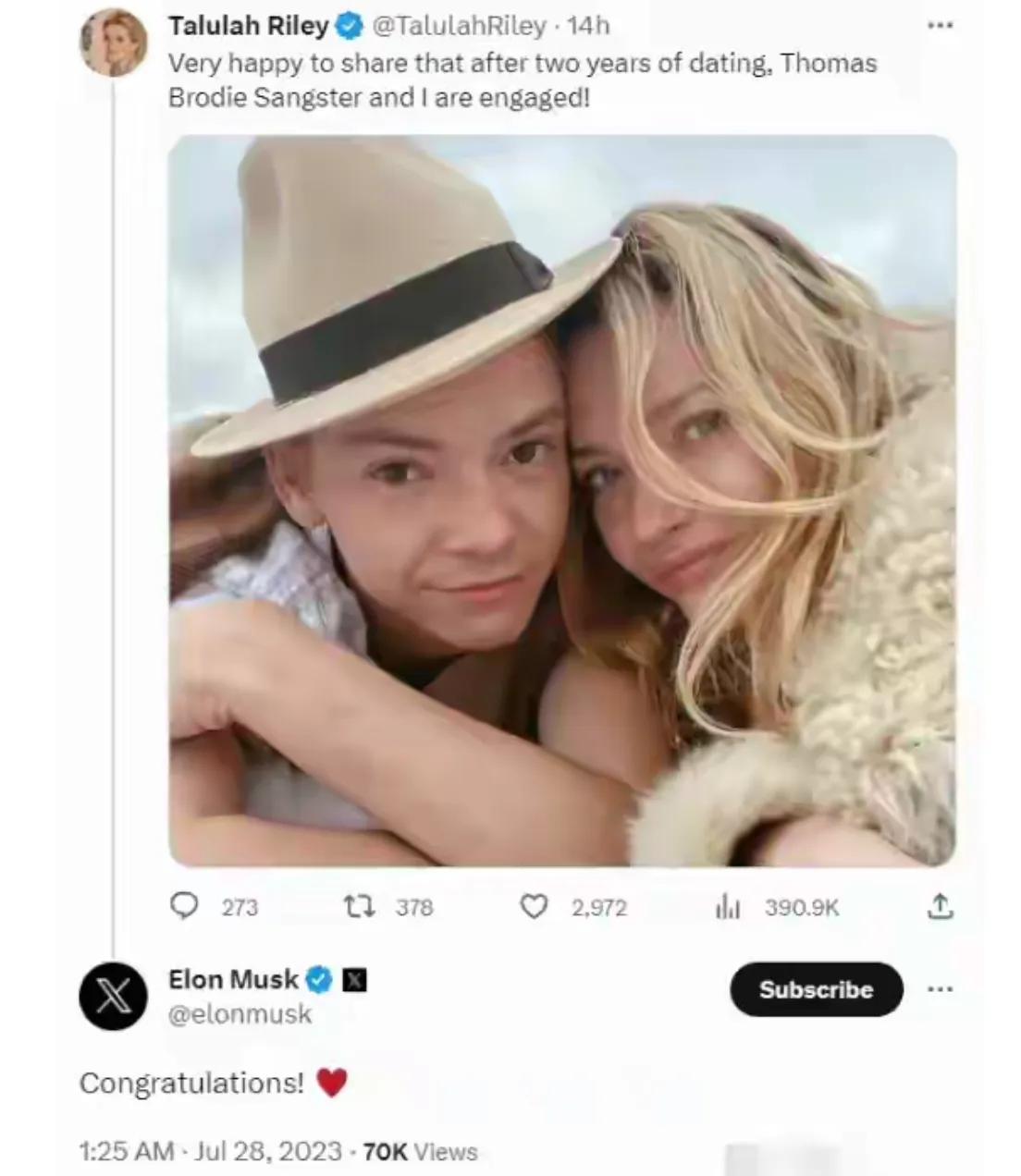 马斯克的前妻妲露拉·莱莉当时正准备嫁给男演员托马斯·桑斯特,她在23年7月公布了她订婚的消息,当时马斯克还给祝贺了前妻。算算时间,马斯克和女作家阿什莉就是在那之后有了交集,阿什莉很快在就怀了他的孩子。马斯克在阿什莉身上看到了前妻妲露拉·莱莉的影子,他对前妻真是余情未了啊。