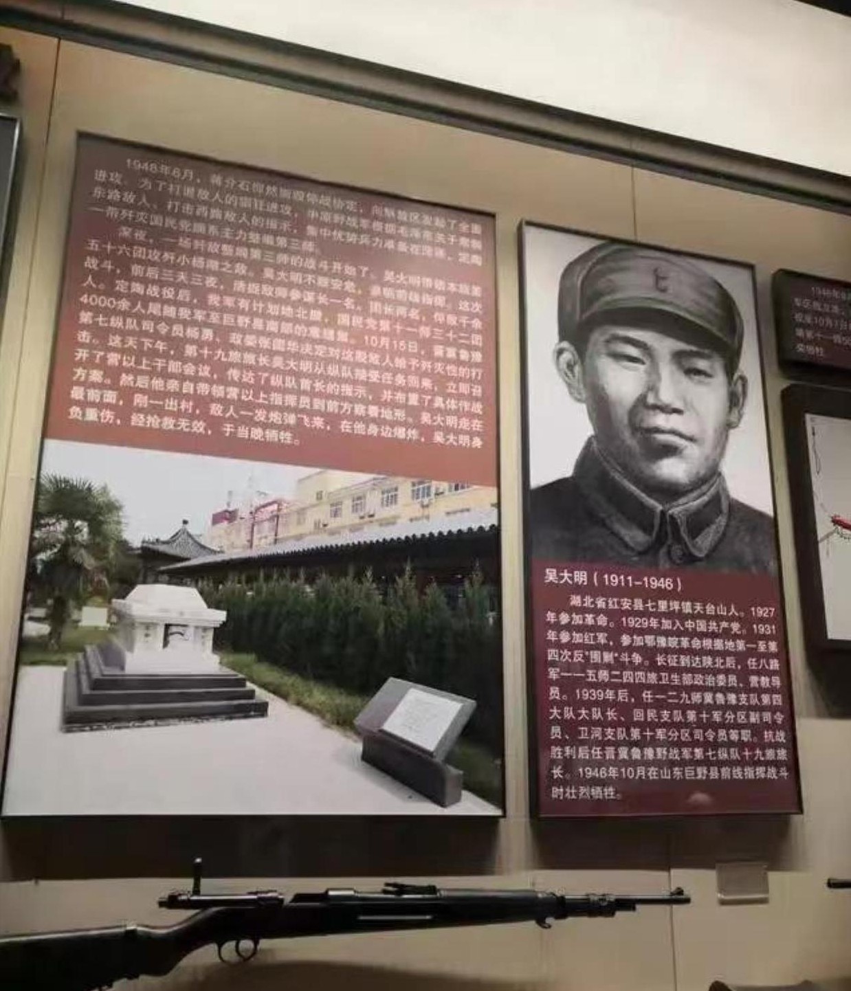 第六位:吴大明吴大明是湖北红安人,自幼生活困苦,八岁时就给地主家放牛,12岁时给一位木匠当学徒,吃了不少苦。1927年,年仅16岁的吴大明参加了红军游击队,3年后进入红二十五军任职,跟随徐海东参加了长征。到达陕北后,吴大明被任命为红十五军团225团政治委员。抗日战争爆发后,吴大明奉命前往山东,任冀鲁豫军区独立大队大队长、第十九团团长,在杨得志的指挥下,打了不少的硬仗、恶战,立下了赫赫战功。抗战胜利后,吴大明被任命为晋冀鲁豫野战军第七纵队第十九旅旅长,率部一举歼灭了小扬湖之敌,为全歼国民党嫡系主力整编第三师作出了突出贡献。1946年10月15日,吴大明在巨野县南部的章缝集前线观察地形时,不幸被敌人的炮弹击中,身负重伤,经抢救无效后壮烈牺牲,年仅35岁。1952年,吴大明烈士的遗骸移葬单县湖西革命烈士陵园,刘伯承元帅亲笔题词:“人民解放军阵亡旅长吴大明烈士之墓。”
