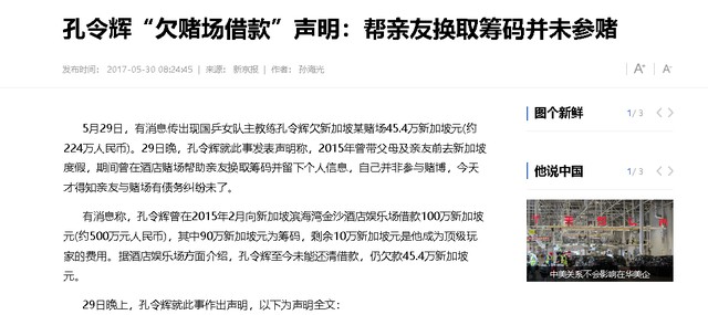 参考资料:新京报——孔令辉“欠赌场借款”声明:帮亲友换取筹码并未参赌