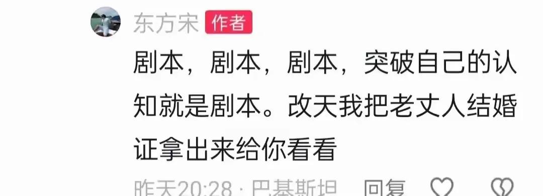 为此,小宋也是很无奈,只留下一句话:剧本,剧本,剧本,突破自己的认知就是剧本。改天我把老丈人结婚证拿出来给你看看