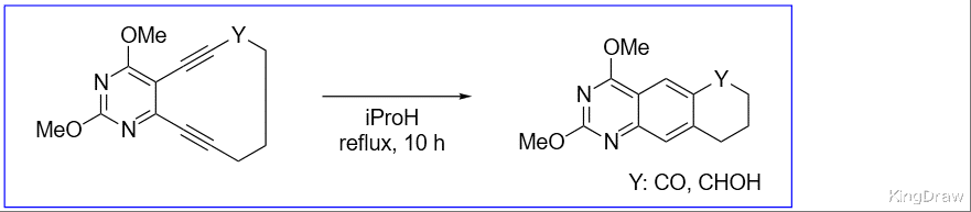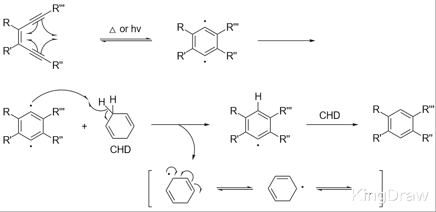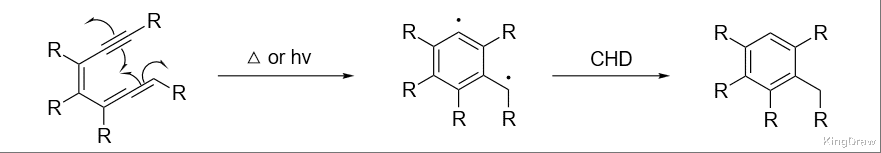 反应机理:启动反应的关键反应条件是加热或者光照。第一步烯二炔环化为苯双自由基的反应是一个典型的可逆电环化反应,一般产生的苯双自由基接下来与反应体系中氢供体(如1,4-环己二烯)作用,产生苯的衍生物,1,4-环己二烯则转化为芳香性的苯。但是如果反应体系中不存在氢供体,那么就很容易发生自由基之间的偶联反应。