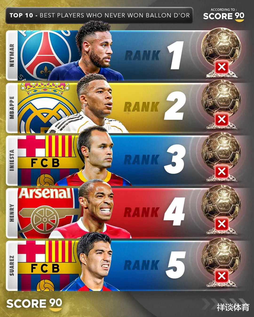 排在第1位的是内马尔,客观来说内马尔的天赋以及其巅峰期所展示出的水准,放在任何足球年代都是顶级的。甚至如果他能够小几岁或者大几岁的话,都有希望争夺金球奖。可唯独在梅西C罗统治足坛的年代,内马尔只能是第3人。再加上伤病的侵袭,所以这位巴西前锋职业生涯与金球奖无缘,这令无数球迷感到遗憾。排在第一实至名归。排在第2位的是姆巴佩,皇马前锋之所以能够排这么高。主要原因在于,现阶段留给他的时间已经不多。