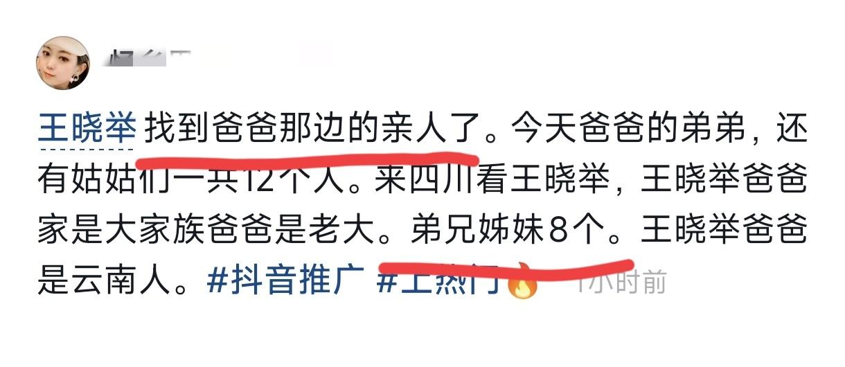 据王晓举在直播中透露,王晓举亲生父亲的家就在云南,他是家中的老大,共有兄妹八人,一个弟弟六个妹妹,也就是说王晓举有一个叔叔,六个姑姑。