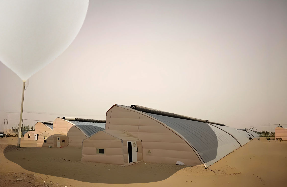 遮阳轻气球安装:在风力发电柱子顶部安装遮阳轻气球,并固定好,以减少沙漠表面的太阳直射。