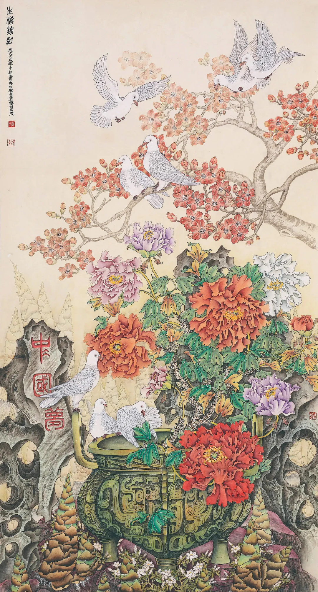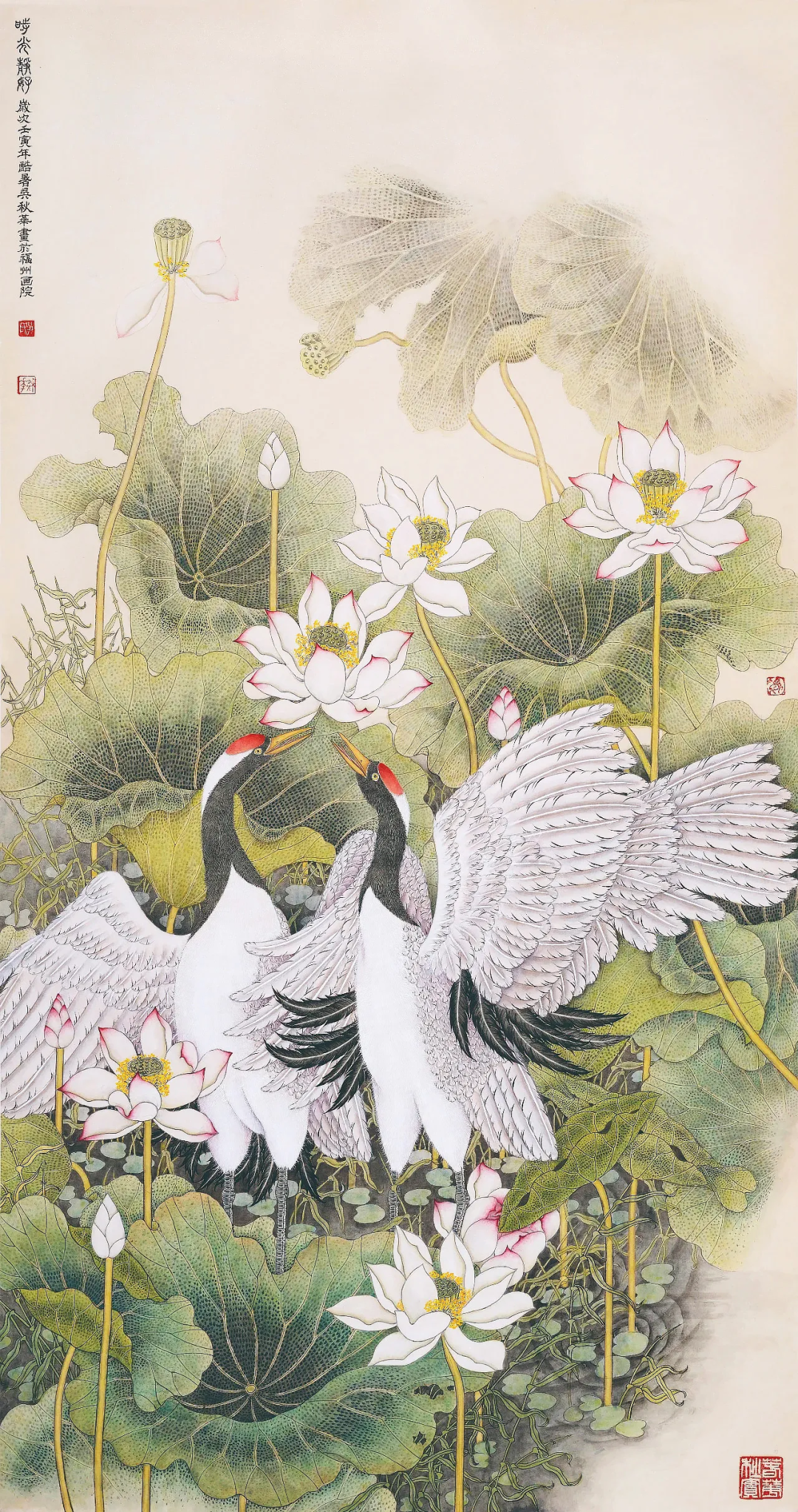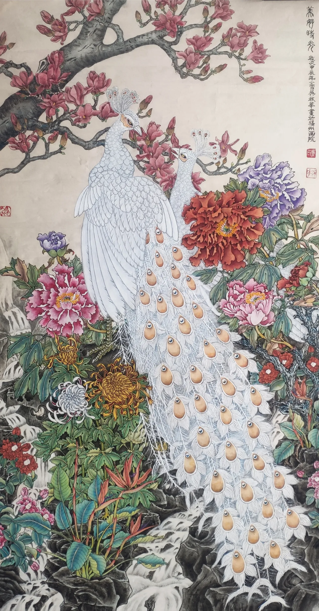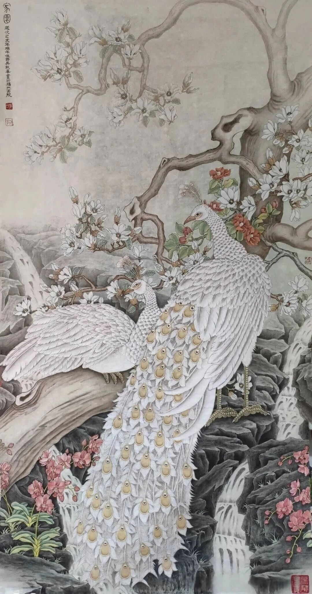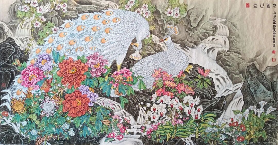 《良辰美景》136×68cm2024年对传统的继承,除了对民族精神的继承外,同时也要继承画面程式和笔墨技巧,如果没有最基本的笔墨语言和表现技巧,那么,对客观物象的感受就算再独特也无法表达出来,从而对客观物象的精神和灵魂的深入把握更是无从谈起,这样所表现的物象就反映不出欲达的艺术风格效果,更谈不上有个性。国画艺术个性的形成关键在敢于创新,使作品耐人寻味。去年金秋,我们有幸在福州画院展厅看到金陵名家江宏伟先生的工笔花鸟画展。江先生的作品,让参观者都会产生一种眼前一“亮”的感觉。这个感觉应是参观有个性的画展才能体现出来的。