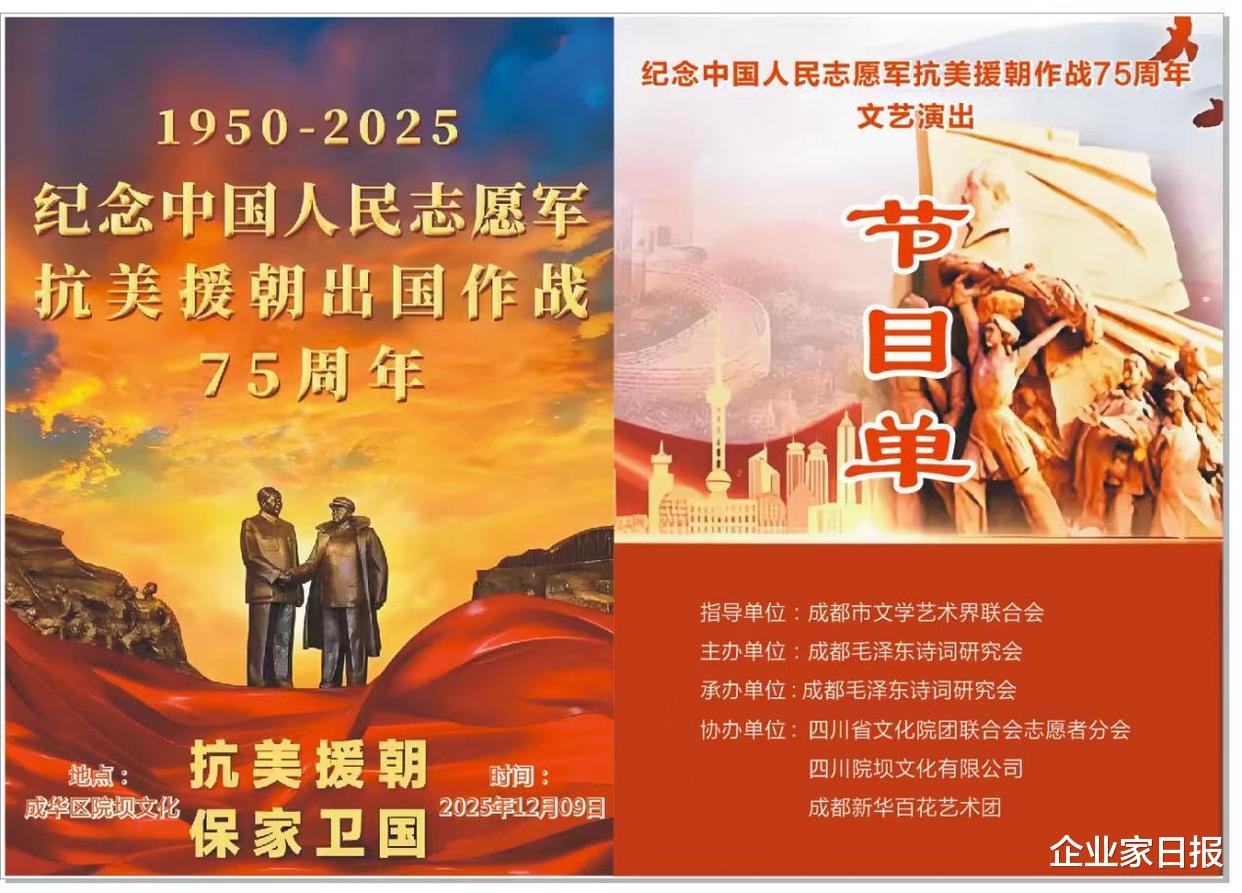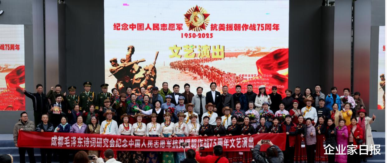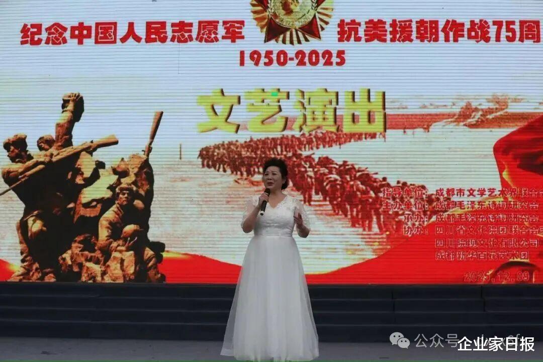 为了铭记历史、弘扬伟大的爱国主义精神,进一步激发广大会员及市民的家国情怀,12月9日,成都毛泽东诗词研究会主办的“纪念中国人民志愿军抗美援朝作战75周年”文艺演出活动,在成都市中心的四川院坝文化广场隆重举行。