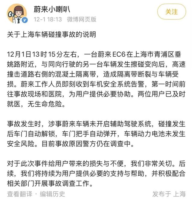 而就在12月1日,上海一起车祸中,一辆蔚来EC6发生碰撞,发生碰撞后车门正常能够打开,电池也未起火,但是车辆直接断成两截,属实是有点看不下去了。
