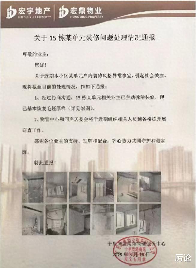 强化物业管理物业公司作为小区的第一道防线,理应承担起更多责任。比如建立日常巡查机制,及时发现并制止异常装修行为。如果当初物业能够早一点发现问题,也许这场风波就不会发生。