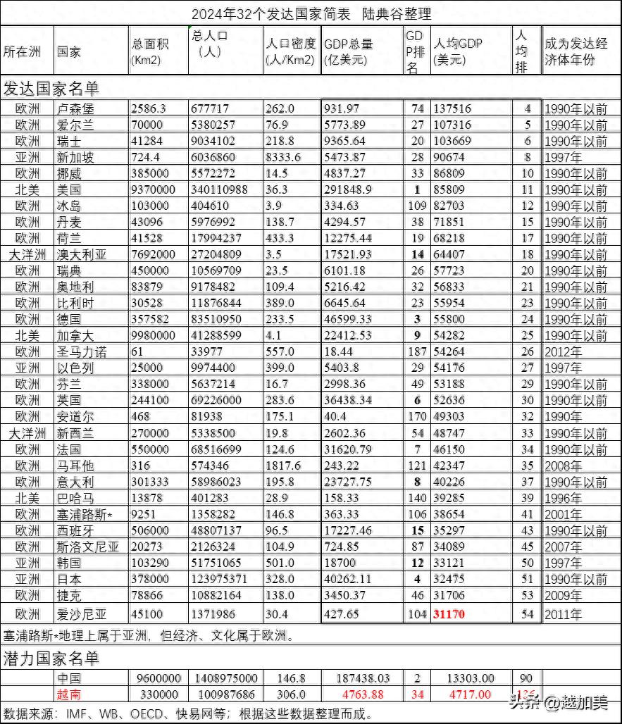 32个发达国家名单(2024)