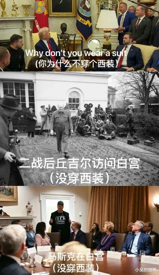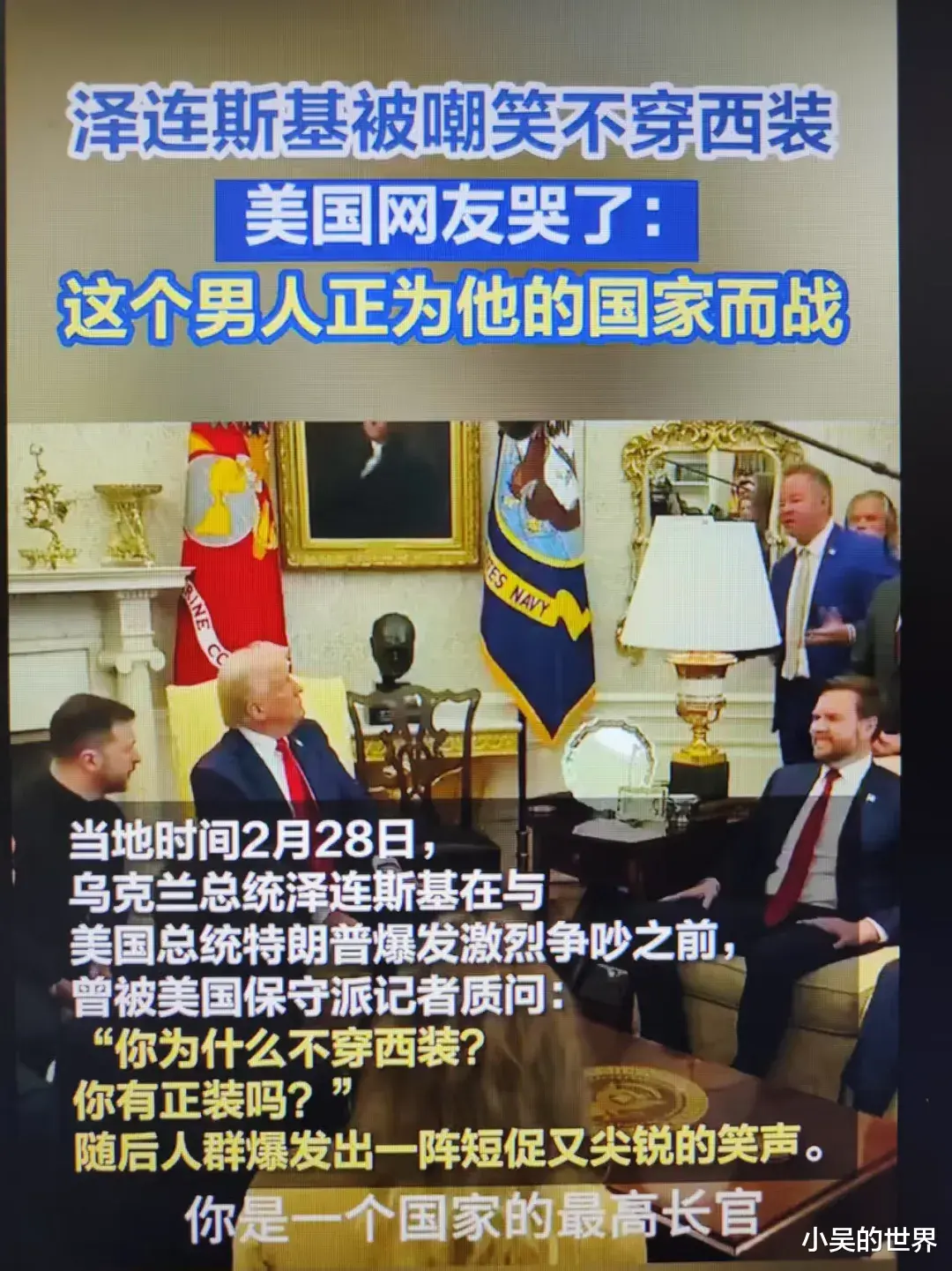 泽连斯基淡定回应:“我有西装,但战争结束后再穿。”这一幕,简直像极了家长训孩子:“你怎么不穿校服?”