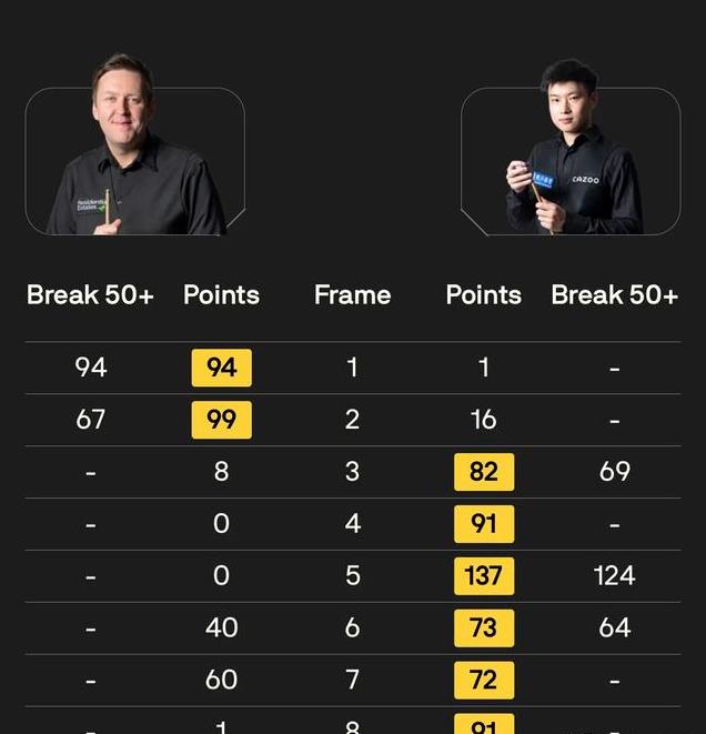 第一局:赵心童略显慢热,沃顿迅速进入比赛状态单杆94分先拔头筹来了个下马威。