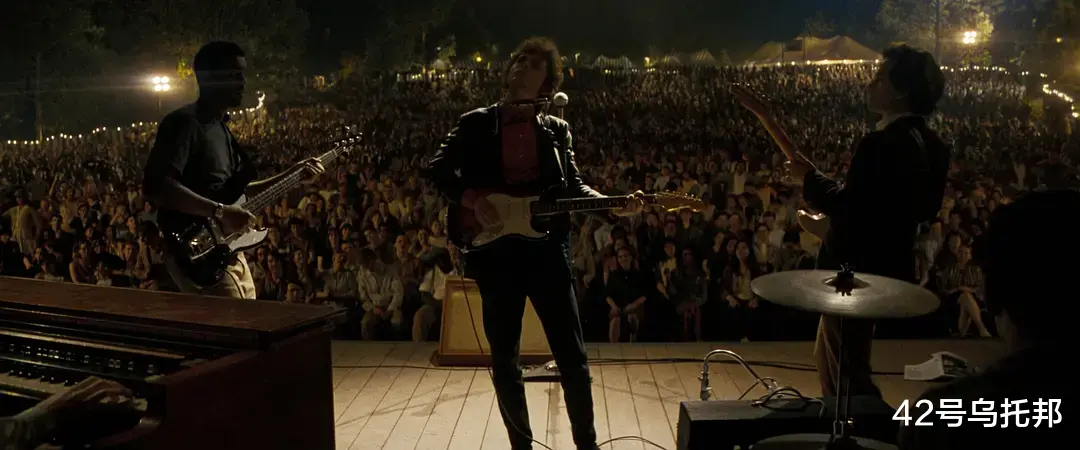 回到电影,影片中由甜茶饰演的鲍勃·迪伦年轻叛逆,他凭借民谣音乐走红之后,却开始反对民谣,玩起了插电的摇滚