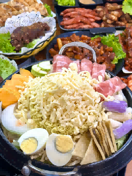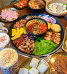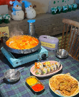 烤猪蹄处理的很好,吃起来黏糊糊的满满胶原蛋白~年糕火锅满满的一大锅有鱼饼、年糕、辛拉面等等,铺上一层厚厚的超长芝士瀑布!!甜辣味与奶香交织~一口下去简直不要太幸福!