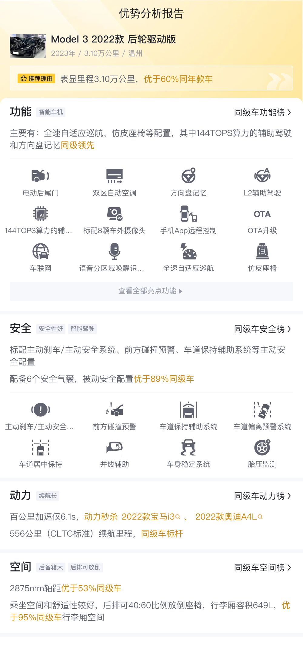 综合来看,这款二手Model 3 2022款后轮驱动版在车况、配置、动力、空间、经济性和保值率等方面均表现出色。它不仅拥有良好的车况和丰富的配置,还具备出色的的动力性能和宽敞的空间,同时在经济性和保值率方面也表现出色。如果您正在寻找一款高品质的电动轿车,那么这款二手Model 3无疑是一个值得考虑的选择。