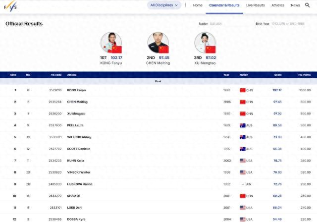 孔凡钰在决赛中表现出色,拿到了102.17分的高分,获得冠军,她也是决赛中唯一得分超过100分的选手。以资格赛第一晋级的陈梅婷拿到97.45分,获得亚军。奥运冠军徐梦桃则以97.02分拿到铜牌。