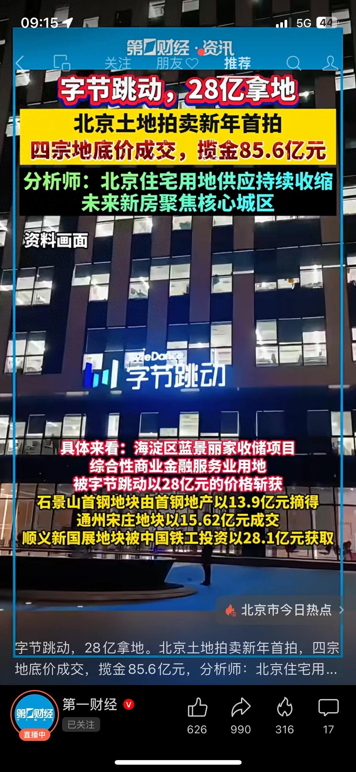 北京新年首批土地拍卖完成,字节跳动以28亿元摘得海淀区蓝景丽家收储项目(综合性商业金融服务业用地),本次四宗地总成交85.6亿元,均以底价成交。