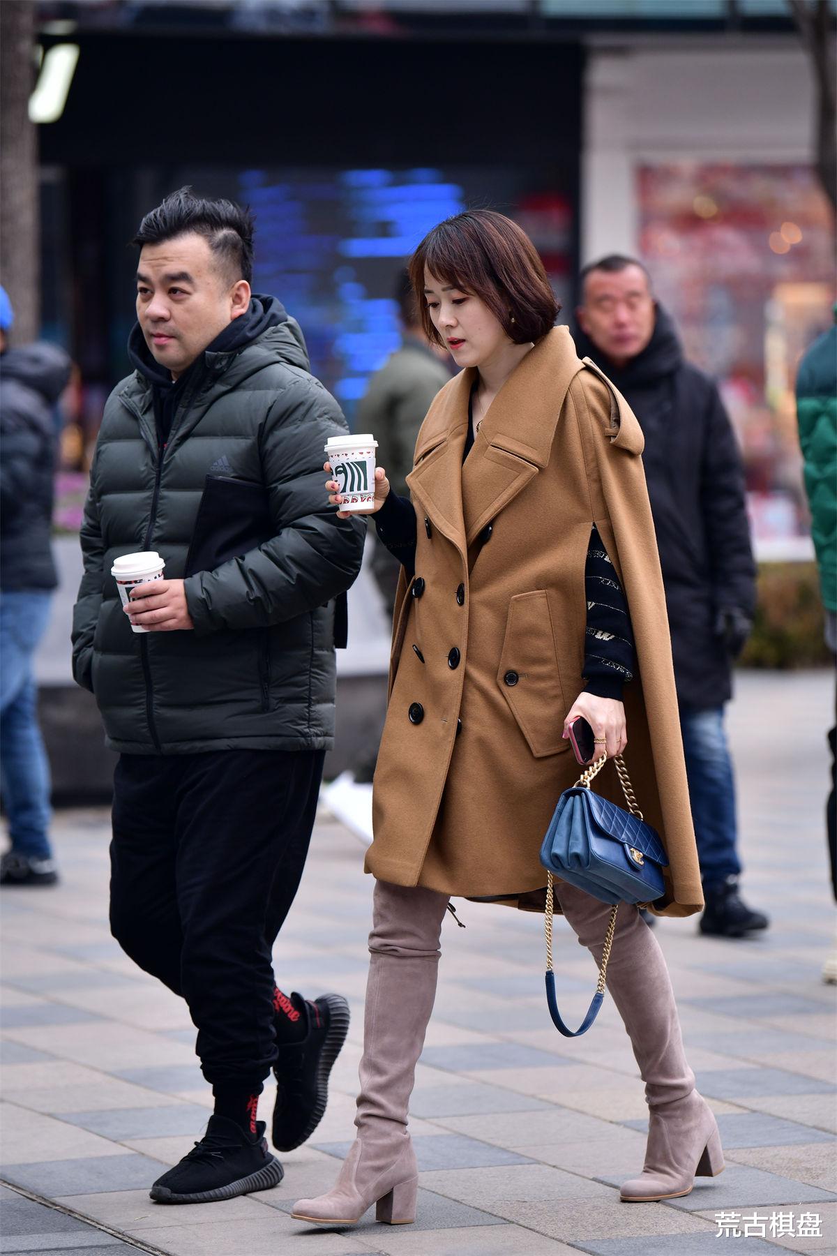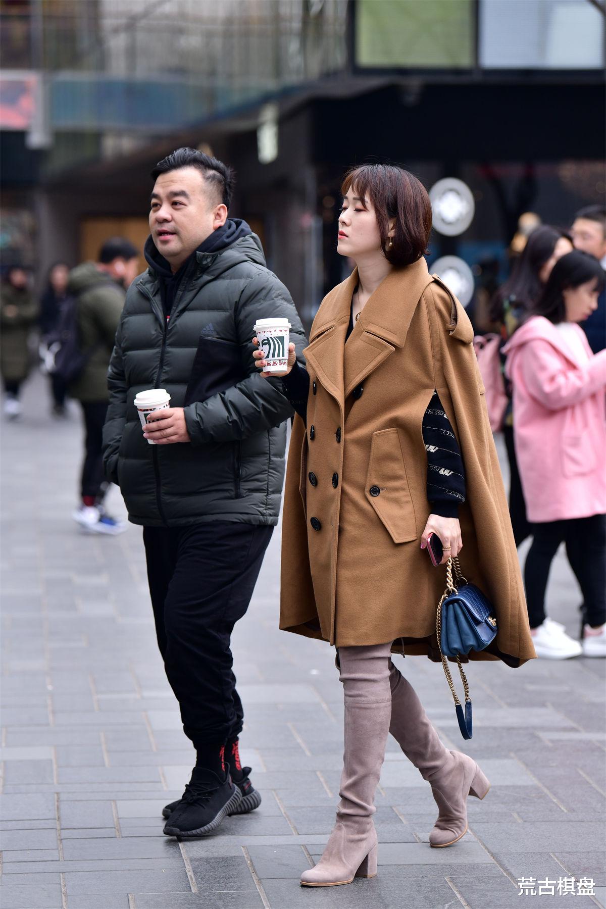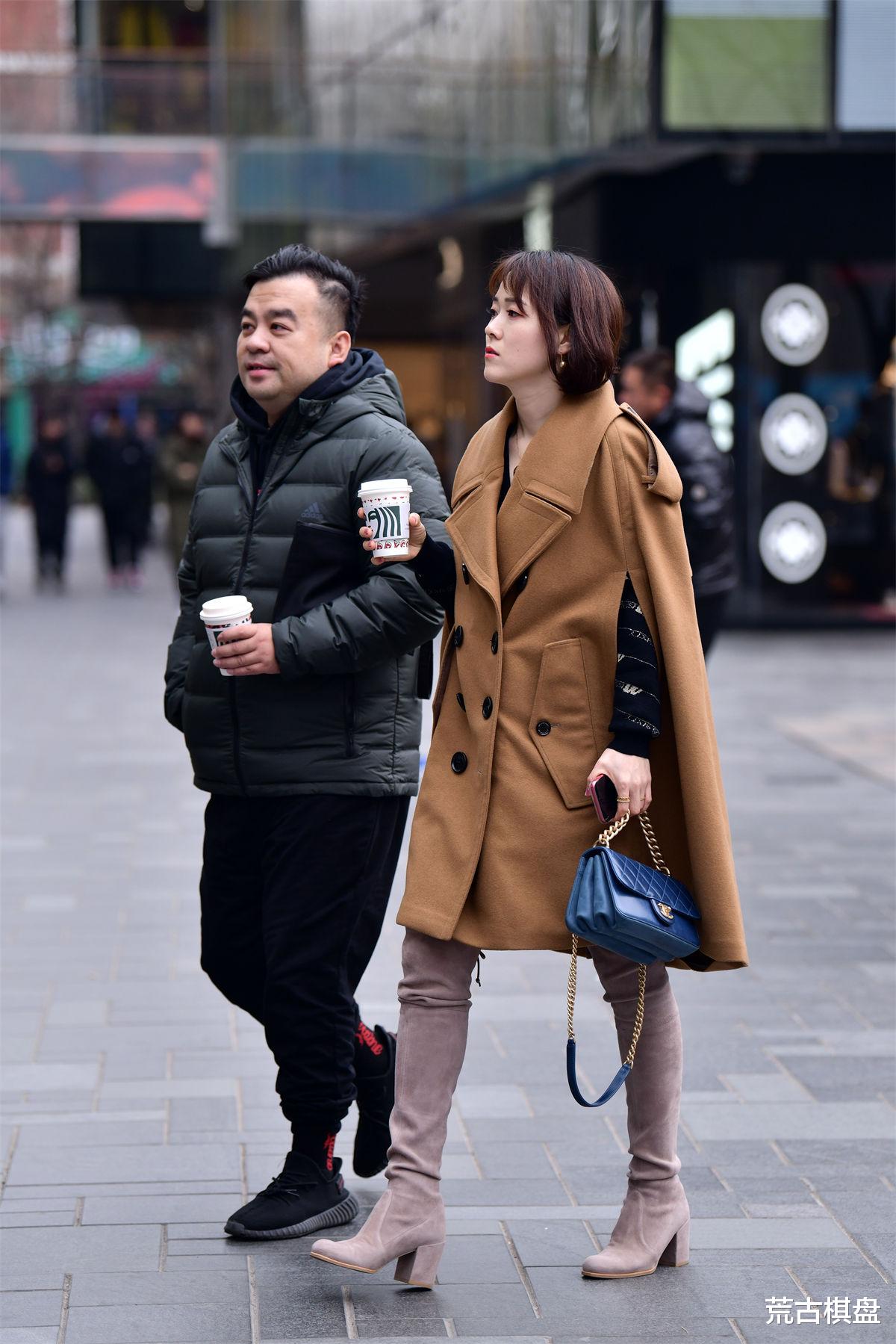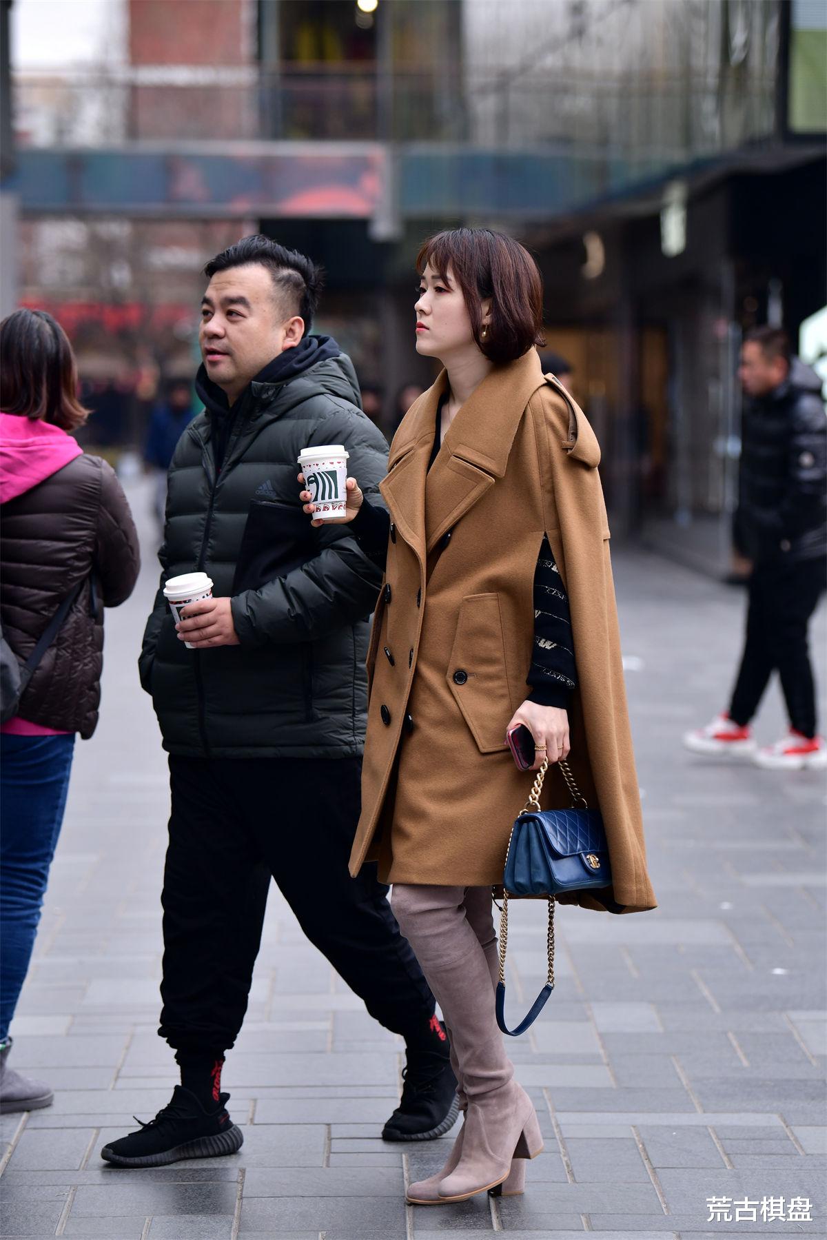 如果说浅色磨砂皮过膝靴是秋冬时尚舞台上的主角,那么蝙蝠风格的棕色呢子大衣则是与之相得益彰的最佳配角。蝙蝠风格以其宽松而不失版型的设计,打破了传统大衣的拘谨与束缚,让穿着者在享受温暖的同时,也能展现出一种随性而不失格调的气质。棕色作为秋冬季节的经典色彩,不仅与浅色磨砂皮形成了和谐的色彩搭配,更在视觉上营造出一种温暖而复古的氛围。大衣的材质选择了优质呢子,既保证了保暖性能,又赋予了衣物良好的垂坠感与质感,使得整体造型更加高级与优雅。