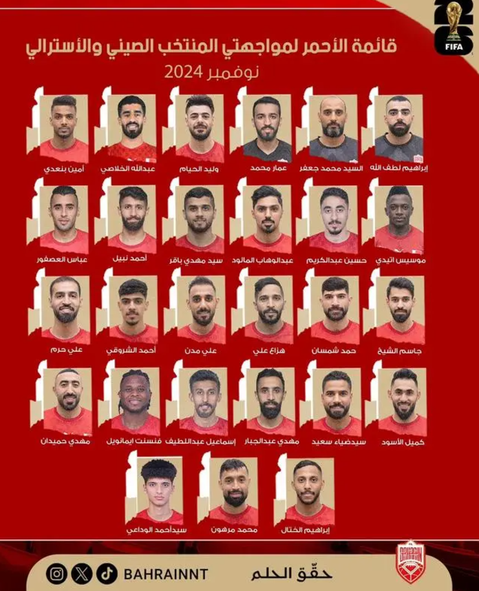 在本次征召的27人名单中,巴林总共有3名海外球员,一位是对阵印尼打入绝杀球的马洪,效力于科威特体育俱乐部,第二位是在马来西亚踢球的中场阿特德,瓦代伊则效力于西班牙比利亚雷亚尔U17青年队。其余球员中,巴林国内两支传统强队穆哈拉克队和里法队入选的球员依然是“国脚大户”,分别有6人和7人入选。