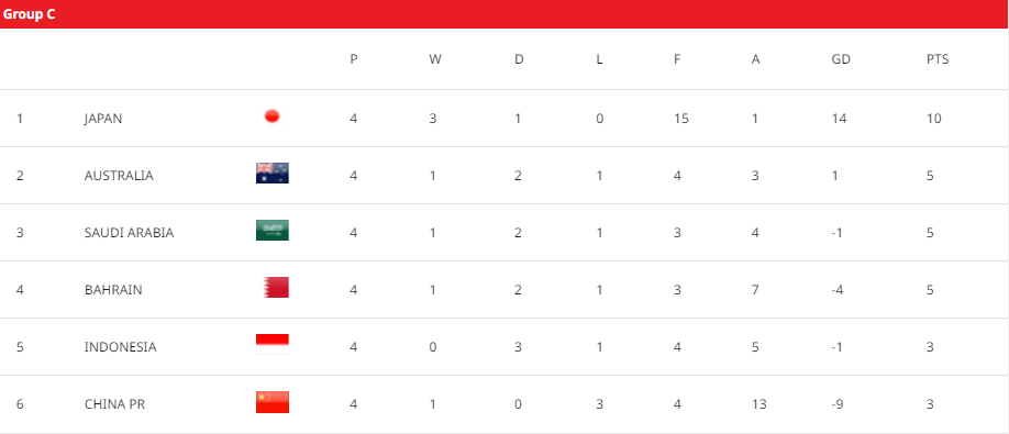 18强赛前4轮比赛,中国男足0-7不敌日本、1-2被沙特逆转,1-3输给澳大利亚,直到上轮才在主场2-1击败印尼取得小组赛首胜。4轮比赛战罢,中国队和印尼同积分3分,但中国队因净胜球劣势而位列倒数第一。巴林首战客场爆冷1-0击败澳大利亚,接下来主场0-5日本,主场2-2战平印尼,客场0-0战平沙特,4战1胜2平1负积5分位列小组第四。