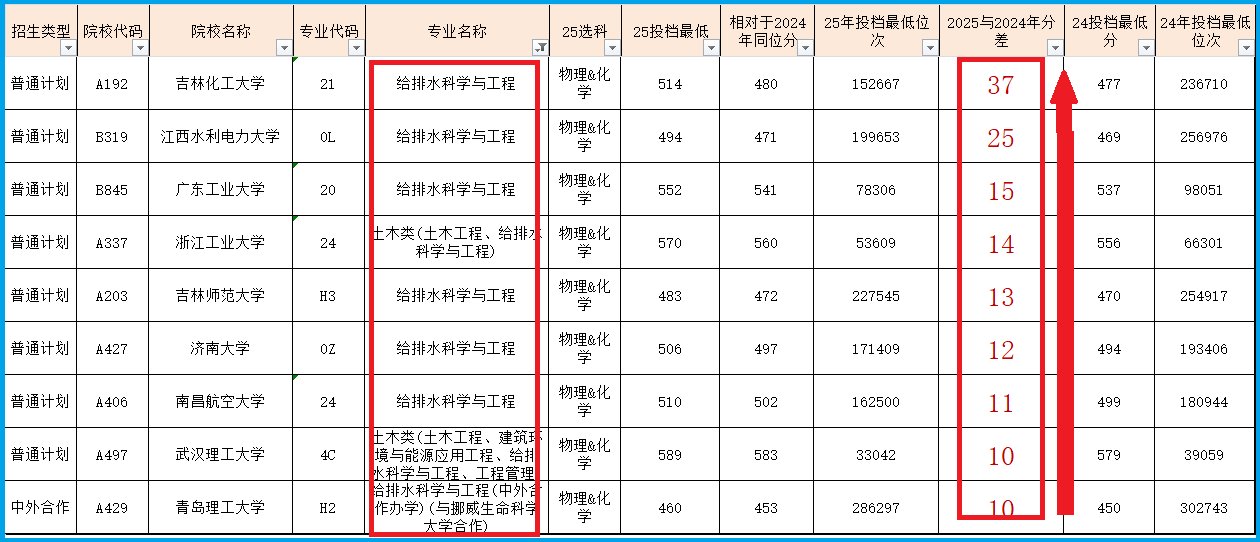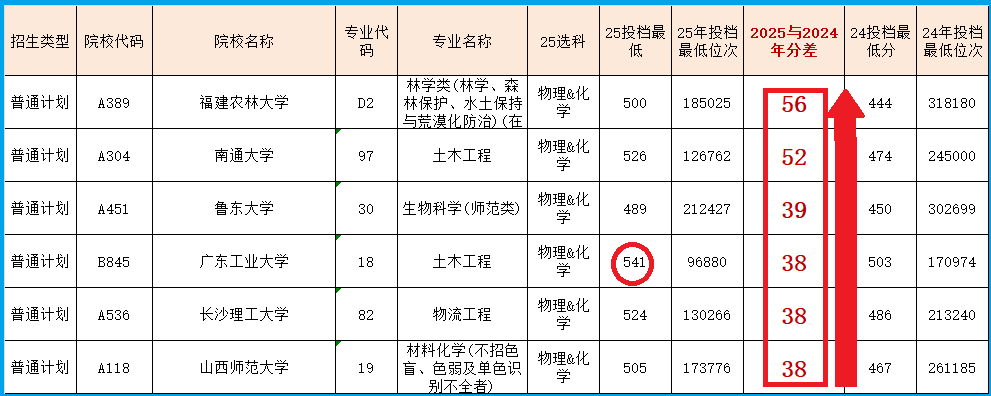 2025年,山东录取结果表明,土木专业开始升温了,南通大学升了52分,广东工业大学升了38分,