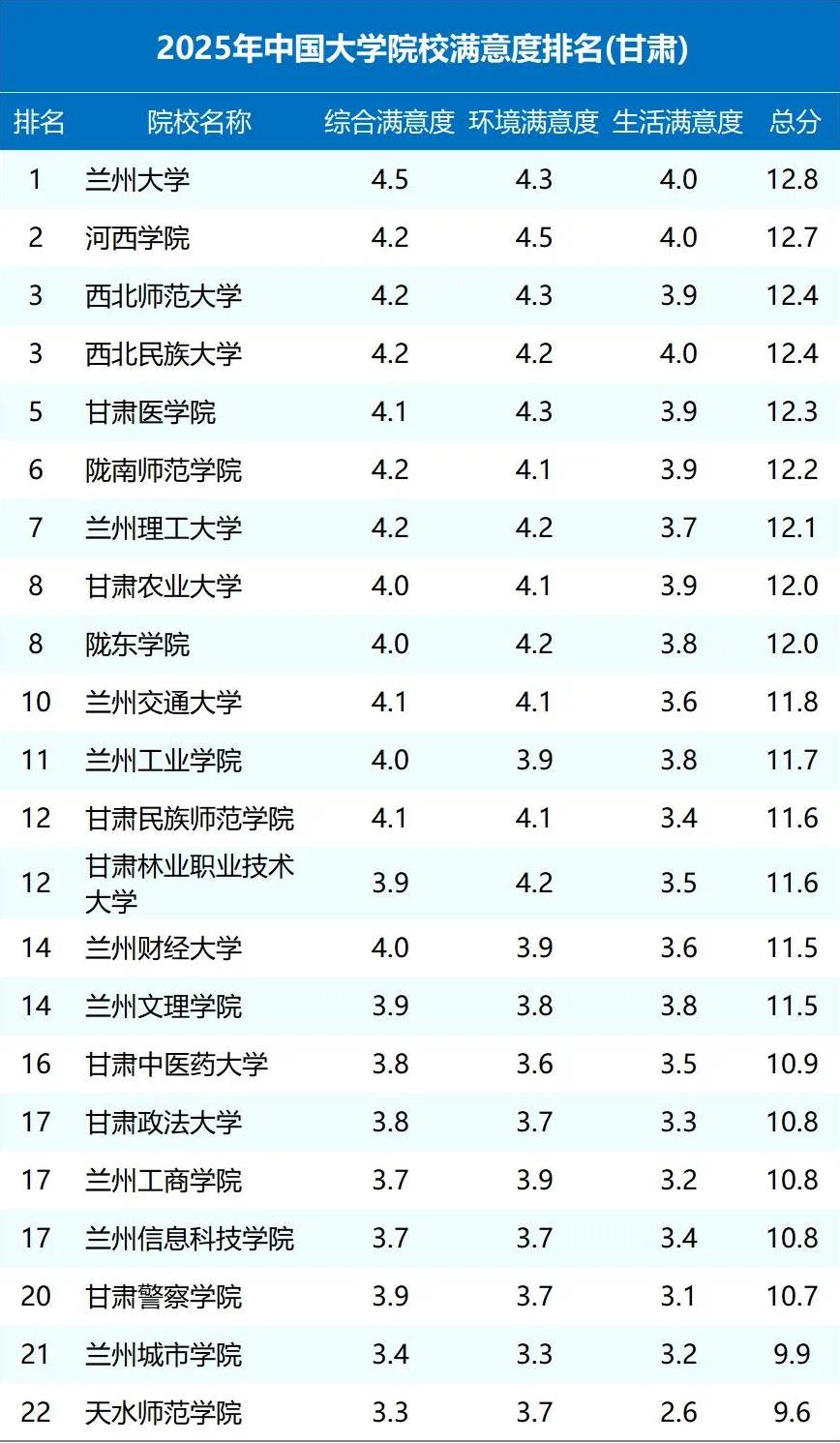 甘肃省文化底蕴丰富,是华夏文明的发源地,也是农耕文明与游牧文明、中华文明与世界文明的交汇地,2024年实现地区生产总值13,002.9亿元,按常住人口计算,全省人均地区生产总值52,825元。在地理位置的影响下,甘肃省的经济水平一般,教育水平也很有限,尤其是高等教育资源,境内只坐落着一所985、211名校。今天,根据ABC排名发布的榜单,来看看甘肃省大学的最新排名情况。甘肃省大学排名重新调整,兰大稳居第一,兰州交大跻身前10这张榜单,并非甘肃省大学综合实力排名,而是甘肃省大学2025年院校满意度排名,不过,荣获第一的还是兰州大学,院校满意度总分为12.8。