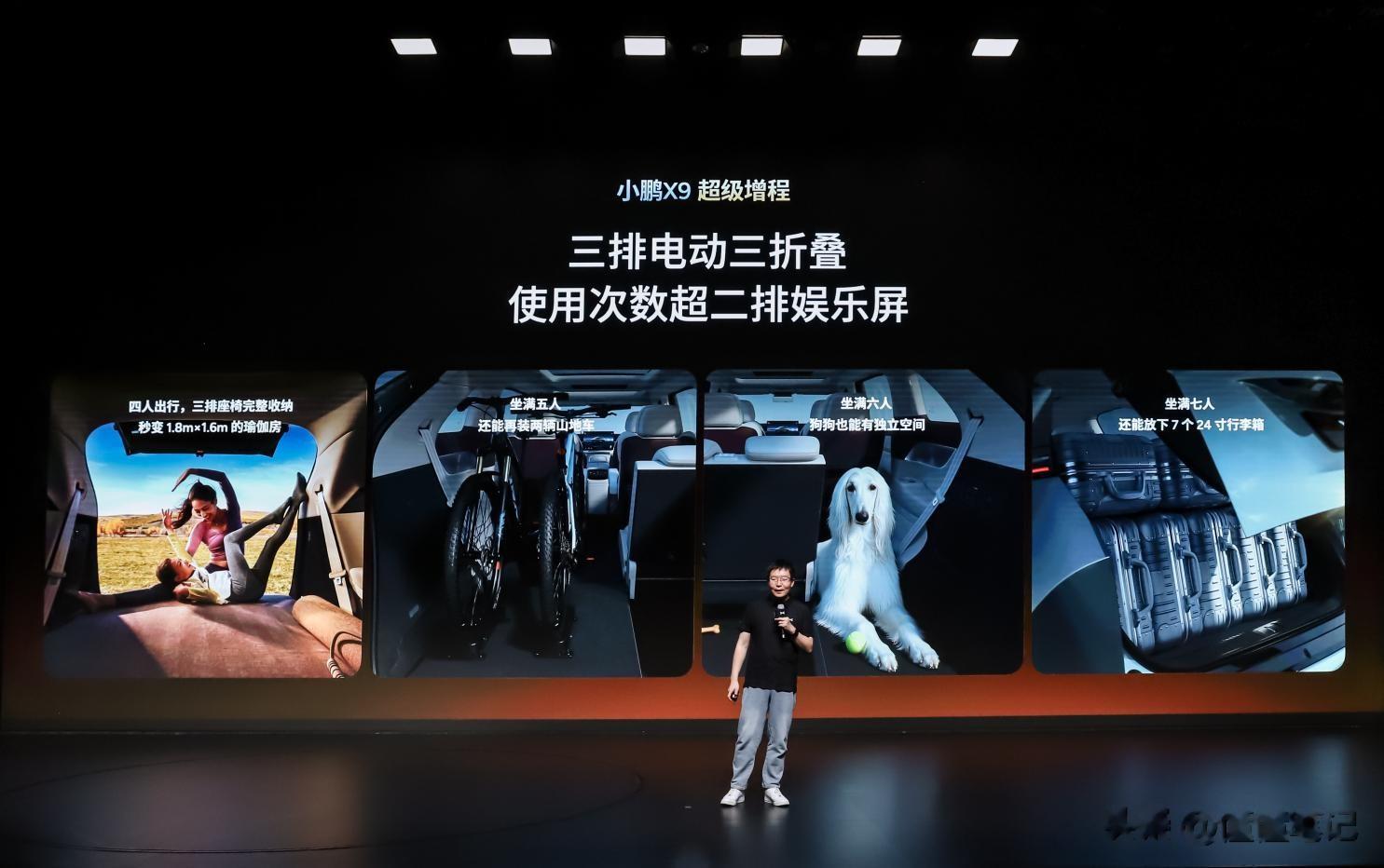 空间灵活性同样领先行业,小鹏 X9 超级增程满足用户丰富出行场景需求。全球首发的三排电动三折叠功能,随时化身可一键切换的“移动LOFT”。该车支持三排4/6分独立收纳,可无缝切换7座满员、6座带宠物、5座载自行车、4座露营大床房等多元模式,真正实现一车搞定通勤、带娃、社交、远行多种出行场景。