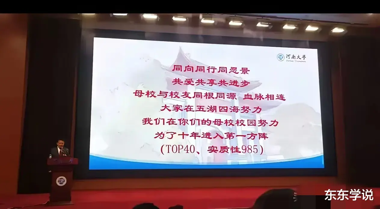 在河南大学一次交流活动上,河大对校友说“大家一起努力,十年内进入大学第一方阵”。