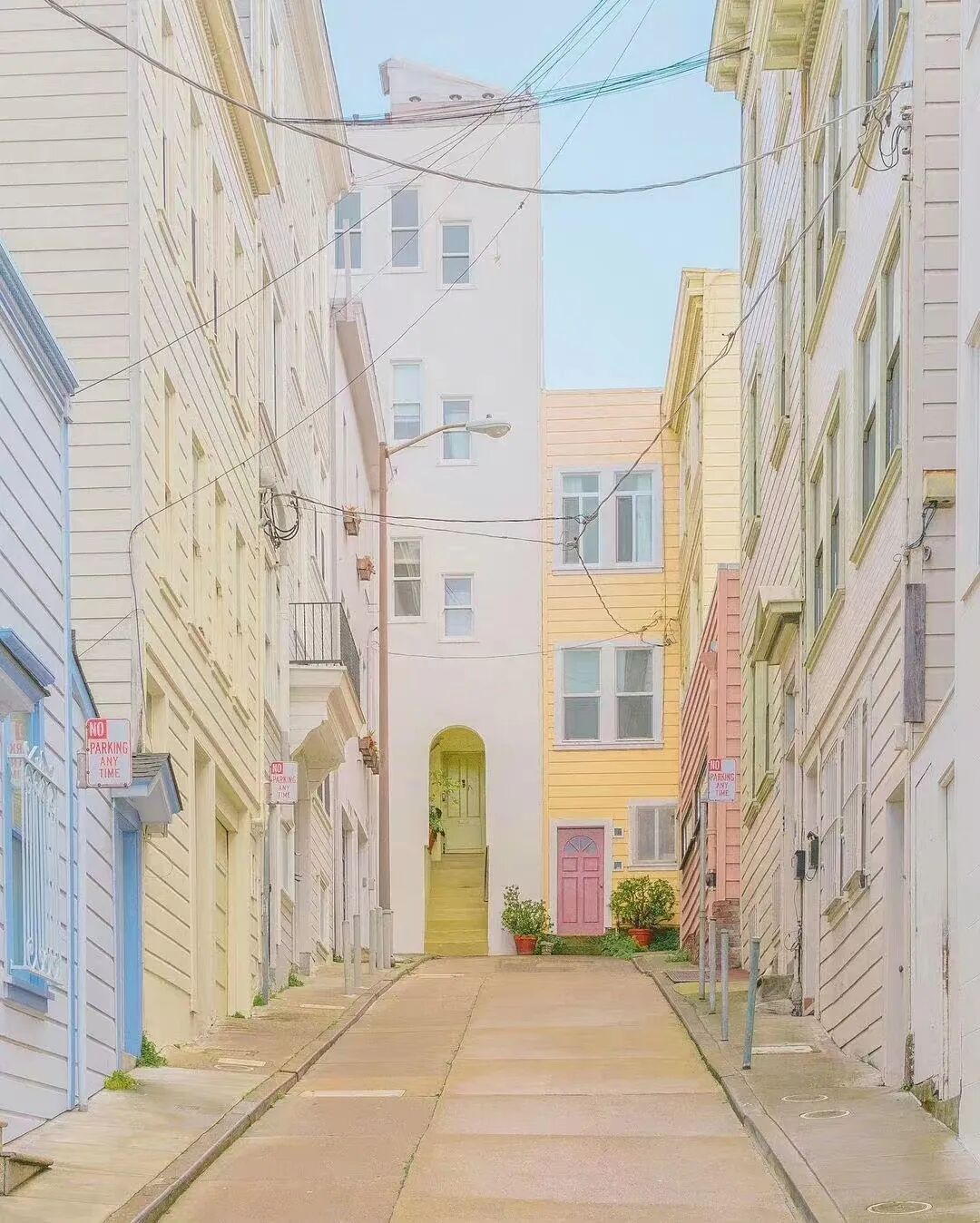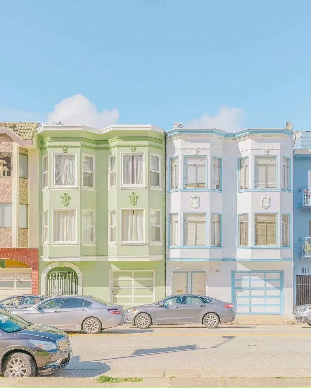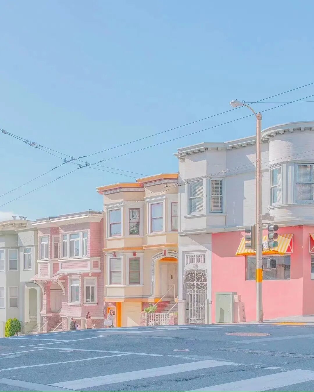 色彩基础好:场景中已经存在一些明亮的颜色,如粉色的墙壁、蓝色的天空、绿色的草坪、黄色的出租车、多彩的冰淇淋店等。