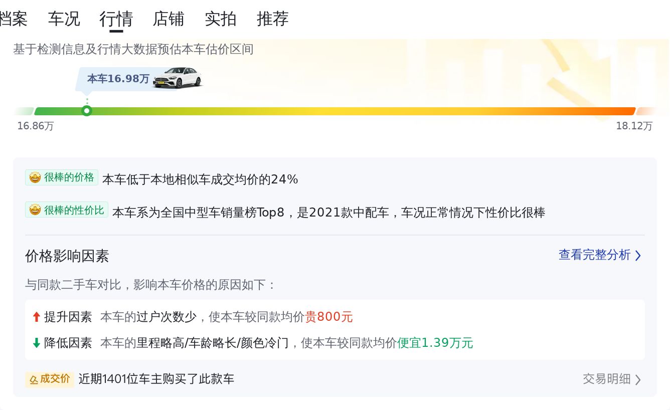 先介绍一下这辆车的基本信息,该车的定位是中型轿车,车身颜色为绿色,设计上走的是时尚路线。车源地和上牌地都是福州。累计行驶里程是7.90万公里,该车符合国VI排放标准。2021年1月首次上牌,期间0过户。这辆车的新车含税价是34.83万,而现在的二手车报价是16.98万,比新车含税价便宜17.85万。