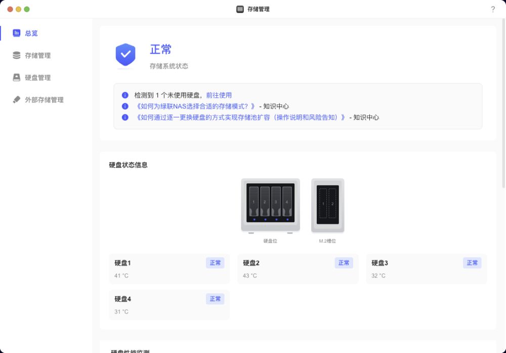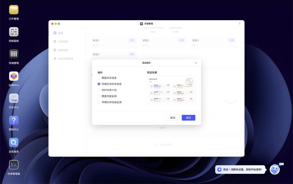 除此之外,“存储管理”功能还支持在“总览”页面添加小组件,比如磁盘性能监测、硬盘状态信息等,这些实用的小组件在其他NAS系统中很少见到。