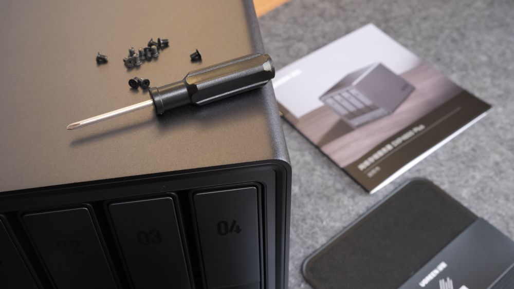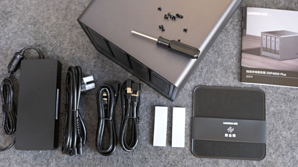 二、开箱与安装:小白也能 5 分钟搞定绿联 DXP4800 Plus产品包含主机、说明书、硬盘锁钥匙、电源适配器、网线、导热硅胶片、防尘网以及螺丝刀等配件,配件都非常实用,在接下来的安装过程中一一介绍。