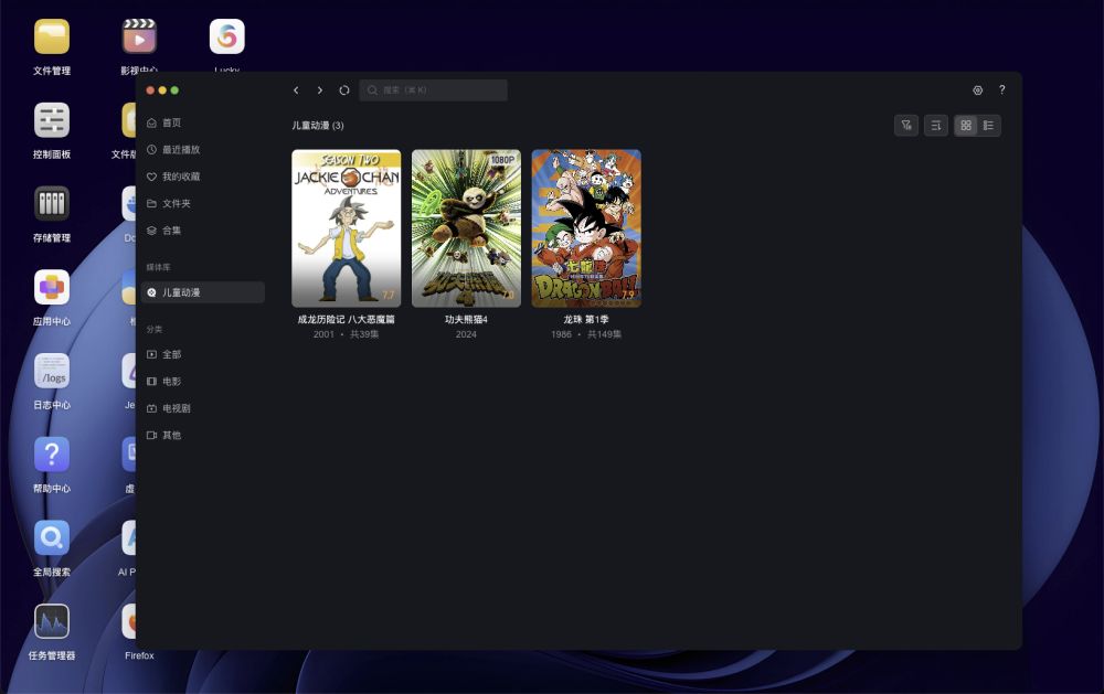 影视中心支持海报墙自动生成,支持TMDB 与智能识别双刮削源,上传的影片会自动匹配海报和剧情介绍,大宝能通过海报轻松找到想看的动画片。