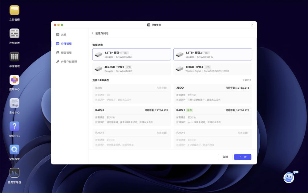 创建存储池时,系统会根据选择的硬盘数量自动推荐不同的模式,比如"raid1 模式"(双盘互备),即使一块硬盘损坏,孩子的照片也不会丢失,安全性远超单硬盘存储。