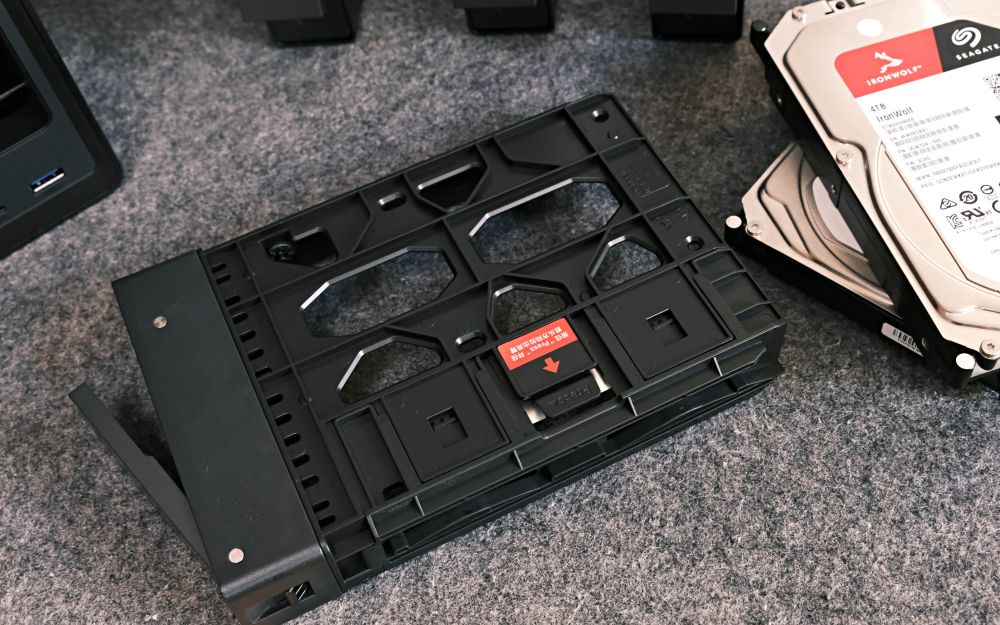 自己这次为绿联 DXP4800 Plus准备了4块3.5英寸机械硬盘,安装过程简单到有手就能完成。在硬盘托背面按下“Press”按钮的同时向外拉动硬盘夹臂,然后把硬盘放置到硬盘托架里就完成了。托架内侧的防滑胶垫会自动贴合硬盘,无需拧螺丝就能稳固固定。