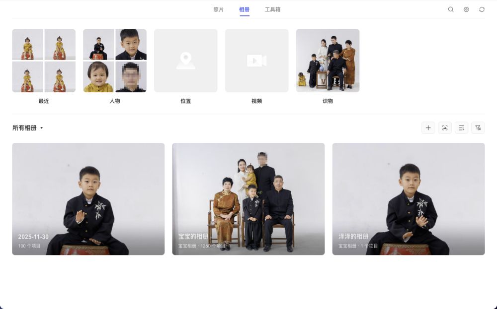 (一)相册:再也不用翻几千张照片绿联云相册是养娃家庭的刚需功能,上传照片后系统会自动分类,省去手动整理的麻烦。要知道拍照一时爽,整理起来却很繁琐,所以自己就需要智能的相册管理软件。