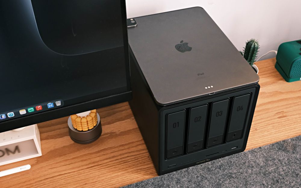 与之前工控机式的NAS产品相比较,自己把绿联 DXP4800 Plus放在桌面使用。机身边角做了圆角打磨,不仅避免了尖锐边角的磕碰风险,摆放时和桌面、机柜的适配度也更高,不会显得突兀。