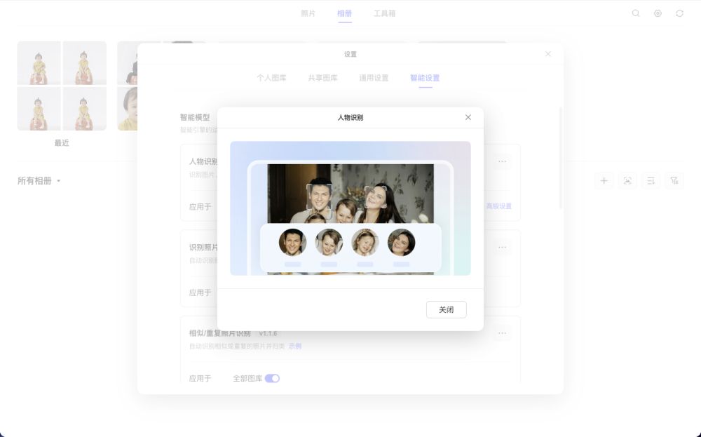 要想相册软件更智能,首先在相册软件的“智能设置”菜单中安装“智能模型”,比如人物识别可以对图片或者视频中的人物归类,场景物体识别可以自动识别照片内容,宠物识别可以识别多种宠物,大家可以根据自己的需求安装其他的智能模型。
