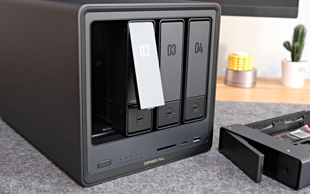 绿联 DXP4800 Plus采用独立快装四盘位组合,每个仓体印有序号,仓体面板下方是弹性卡扣式免工具结构,只需按下仓体按钮,硬盘托架就能“轻弹式弹出”。每个盘位最高30T的硬盘存储,最大容量支持136T(包括硬盘120G+M.2固态16G)想想自己能够用好多年,完全不用担心家里的照片、视频数据无处可存了。