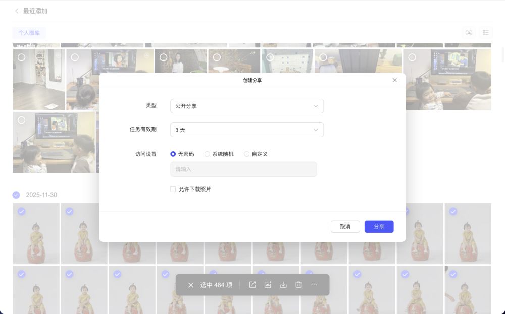 跟文件管理类似,在相册中也支持共享,可以设置相册共同管理和站外分享,权限可以设置分享有效期、访问密码以及是否允许下载。