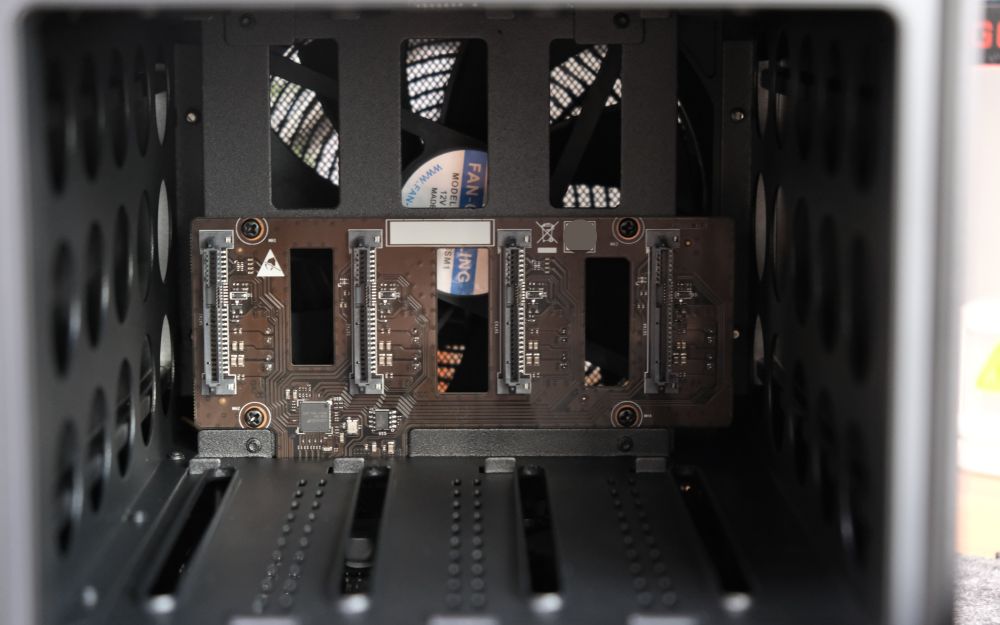 机器采用“后进前出”风道设计:正面盘位之间的2mm缝隙+机身底部的隐藏式格栅是进风口,背部配备一枚14cm静音液压轴承风扇,日常轻负载时噪音仅22dB,相当于图书馆的环境音。