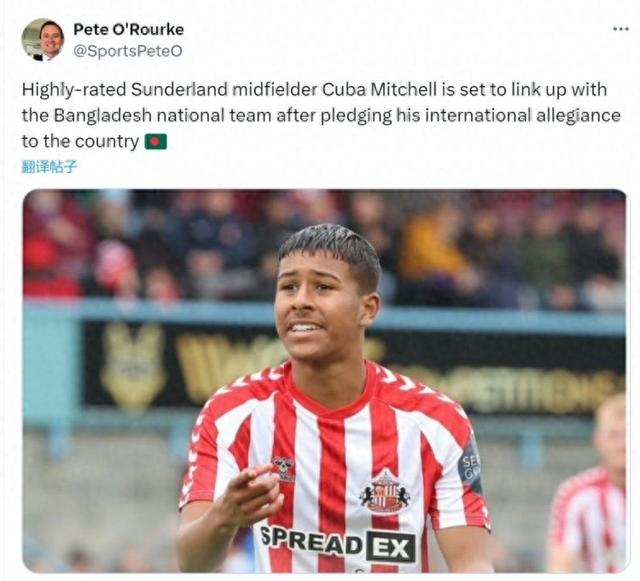 Pete O'Rourke透露,孟加拉国归化桑德兰小将米切尔,这位备受看好的19岁中场已经同意为孟加拉队效力。